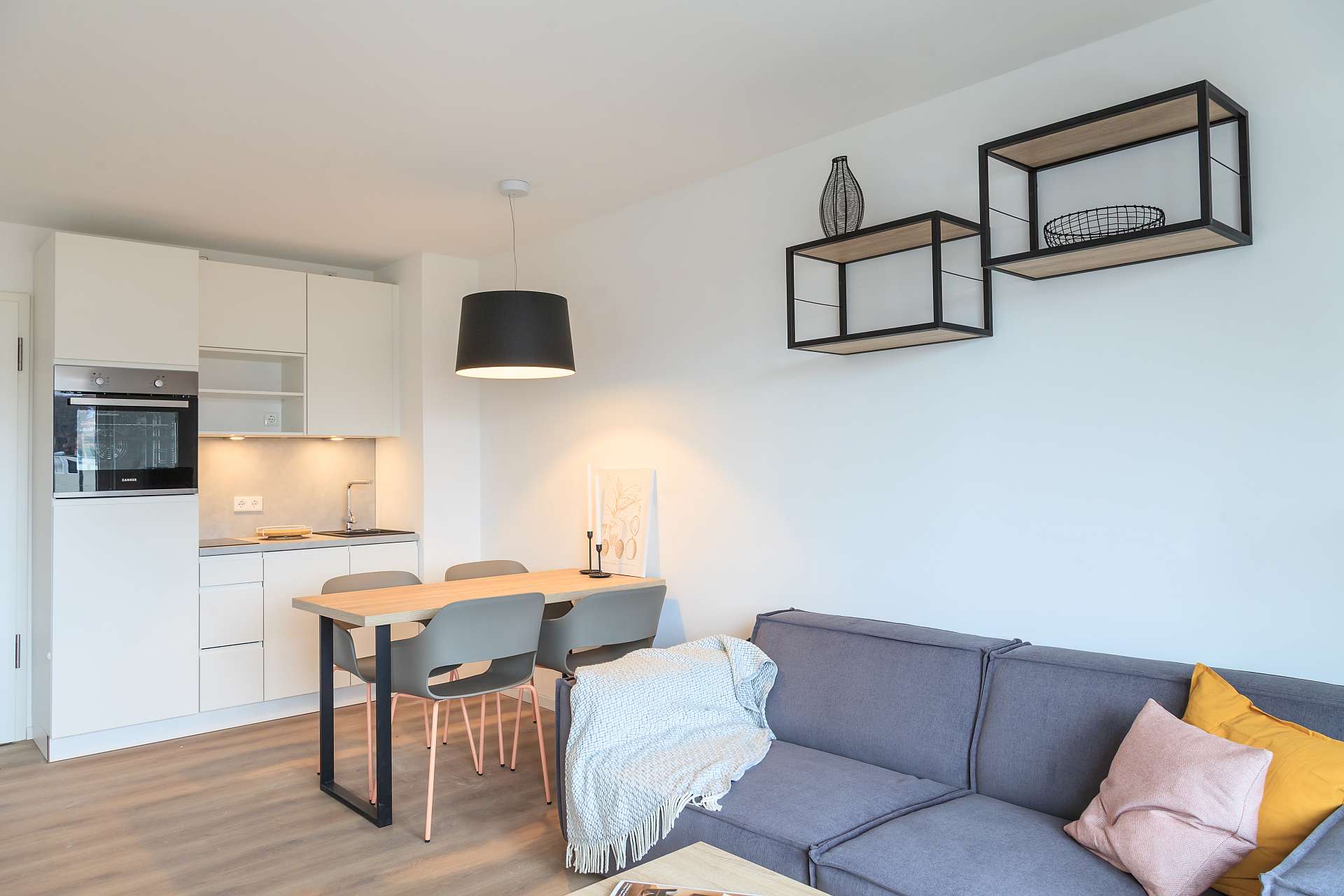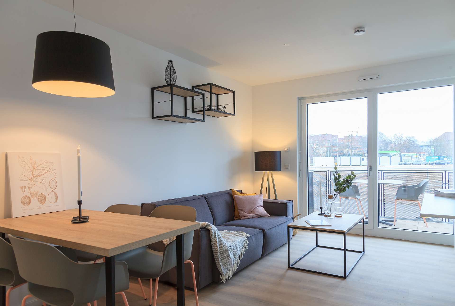 In unseren City-Apartments heißt es einziehen, auspacken, wohlfühlen. Von Anfang an. Denn alle Wohnung sind bereits teilmöbliert und bieten eine einheitliche Grundausstattung – egal, ob Sie sich für die 1- oder 2-Zimmer-Variante entscheiden. Die Einbauküchen verfügen über hochwertige Elektrogeräte und passen dank der weißen, zeitlosen Fronten stets zu ihrem persönlichen Einrichtungsstil. Ihre Badutensilien finden Platz in einem modernen Spiegelschrank. Die 1-Zimmer-Varianten werden zudem mit einem funktionalen Raumteiler mit integriertem Schreibtisch versehen. Dieser bietet viel Stauraum und trennt Arbeiten und Wohnen geschickt vom Schlafbereich. Auf Wunsch können Sie Ihre Wohnung – ganz oder in Teilen – mit einem interessanten, flexiblen Angebot an zusätzlichen Möbeln erweitern oder gar vervollständigen. Was Sie brauchen, bekommen Sie von uns – was Sie wollen, bringen Sie mit. Das Leben kann so einfach sein.