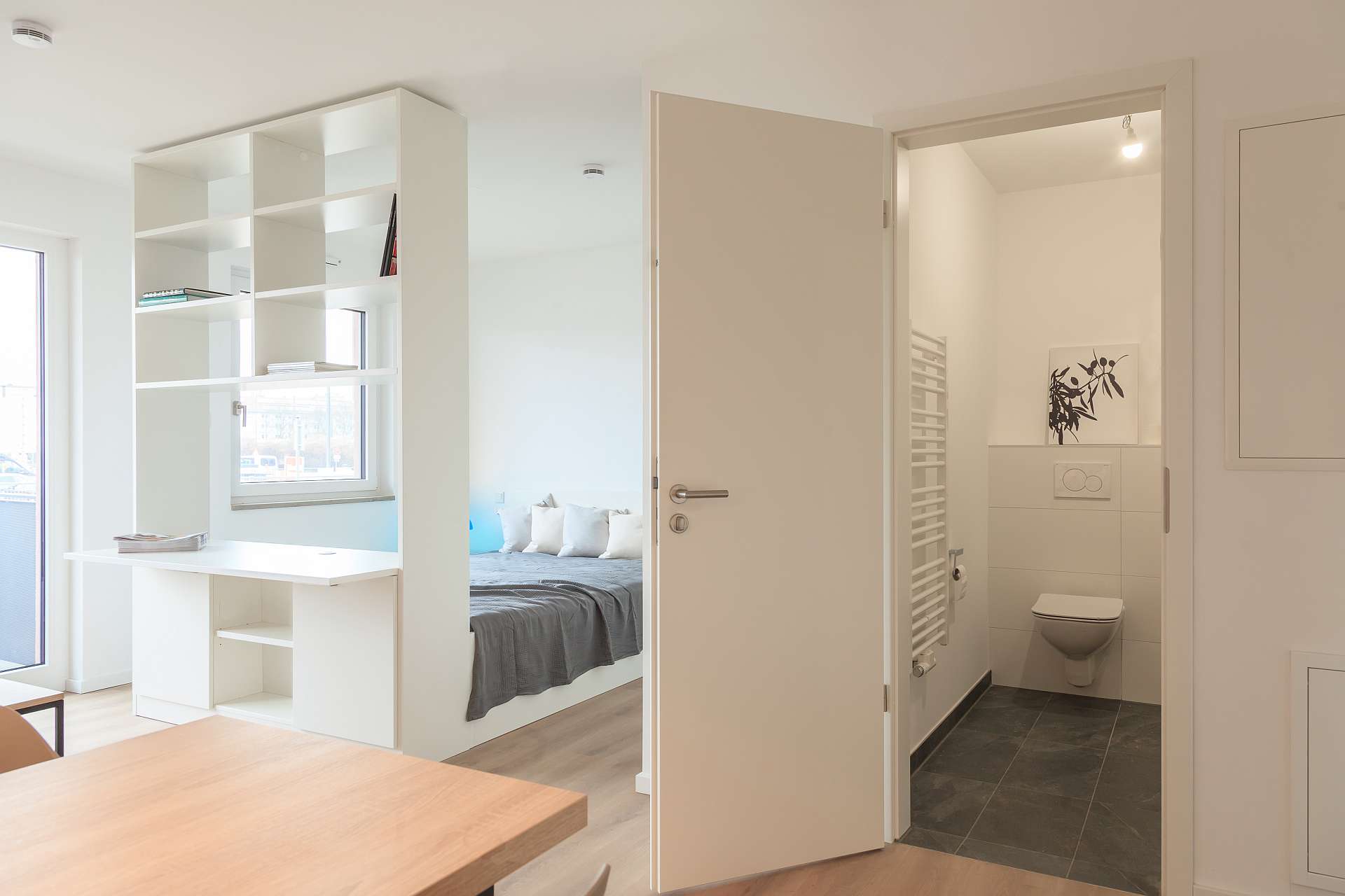 - 1-Zimmer-Wohnungen mit Regal als Raumteiler mit Schreibtisch, Bettgestell und Lattenrost