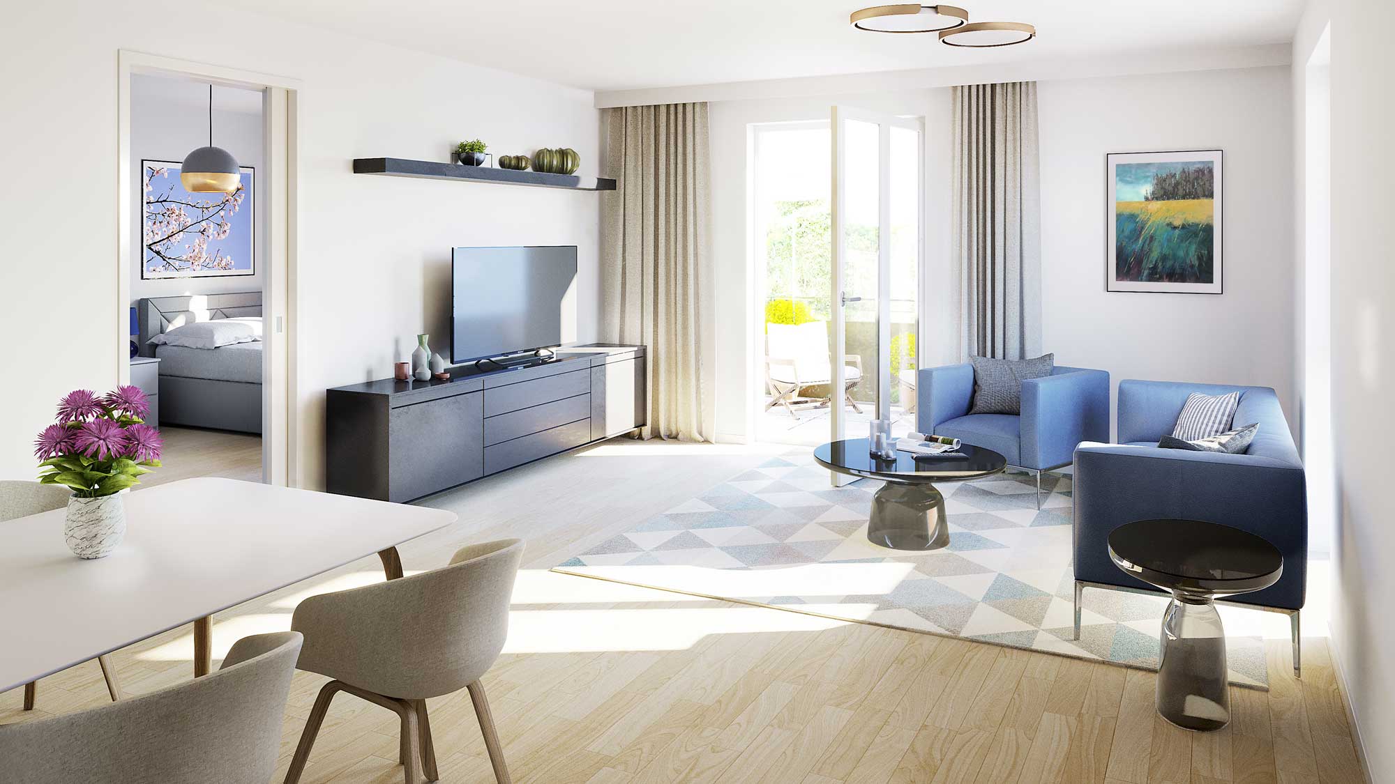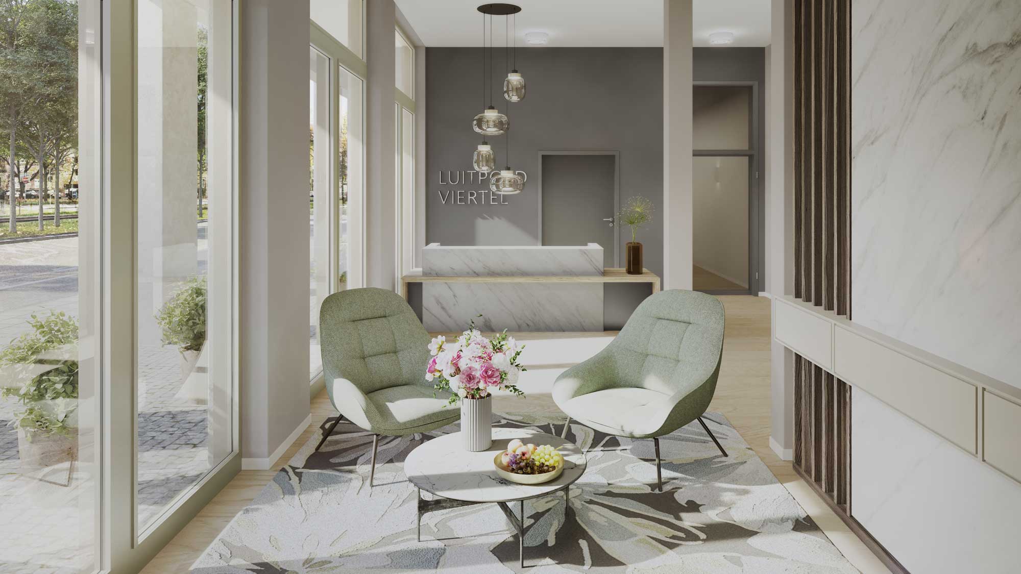 Eine zeitlos moderne Architektur charakterisiert das Erscheinungsbild des neuen Service-Wohnens für Senioren im LUITPOLDVIERTEL. Liebevoll gestaltete Grünanlagen, ein quartierseigener Park und eine einladende Terrasse bieten viel Freiraum für Ruhe oder gemeinsame Unternehmungen.